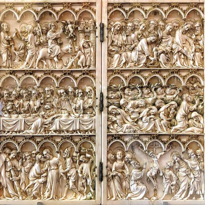 La pieza consta de dos placas de marfil tallado unidas por dos bisagras. Cada placa se divide en tres registros en los que se narra la historia de la Pasión. En este sentido, las seis escenas se desarrollan bajo una arquería gótica que marca un ritmo de secuencias y que, a la vez, tiene un carácter unificador que construye y enrique el conjunto.