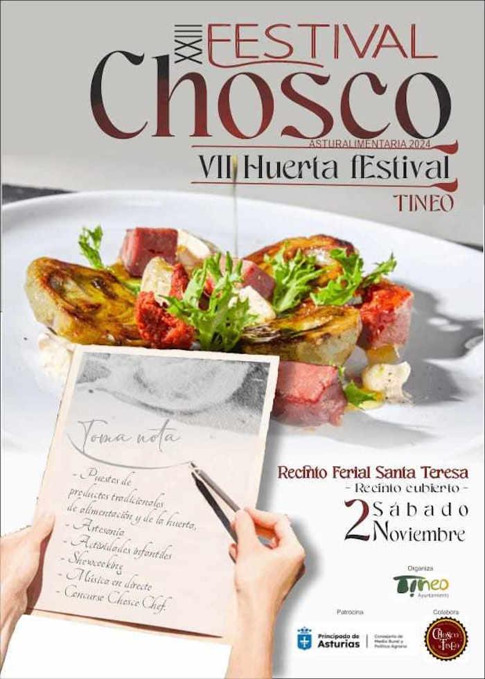 El Recinto Ferial Santa Teresa en Tinéu acoge la XXIII edición del Festival del Chosco, una feria agroalimentaria que tiene como objetivo la promoción y venta del producto gastronómico más emblemático del concejo y la VII edición de la Huerta Festival (Asturalimentaria), un festival que pretende ser un escaparate para la venta de los productos excedentes de la huerta local principalmente, abriéndose la posibilidad de que estén presentes vecinos y vecinas de otros concejos. Aparte de productos de la huerta podremos encontrar pequeños frutos, setas, castañas, naranjas, ajos...