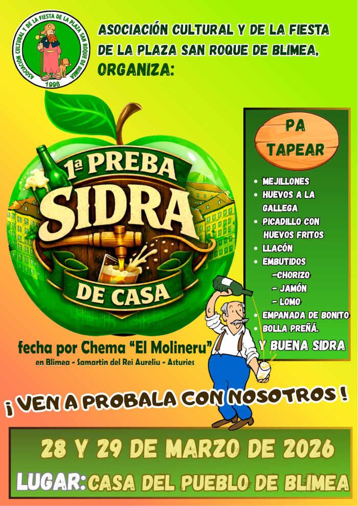 Blimea celebra la 1ª preba de la sidra de casa, además para acompañar nuestra bebida tradicional se podrá tapear ya que ofrecen mejillones, huevos a la gallega, picadillo con huevos, llacón, embutidos, empanada y bolla preñá.