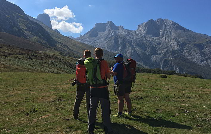 Wenn wir den Pass erreichen, haben wir auf beiden Seiten des Passes eine außergewöhnliche Aussicht, und auf der linken Seite können wir sehen, wie der Gipfel des Naranjo de Bulnes (Pico Urriellu) herausragt. Die Route beginnt mit einem Abstieg, der an den Hütten der Ente los Bosquines vorbeiführt. Kurz darauf führt der Weg in Serpentinen durch ein Gebiet mit Kalksteinfelsen auf der rechten Seite, und bald darauf erreichen wir einige Wiesen, von denen aus wir die Silhouette des Pico Urriellu betrachten können, der die Kanäle Balcosín und Camburero überragt. Kurze Zeit später erreichen wir Bulnes.