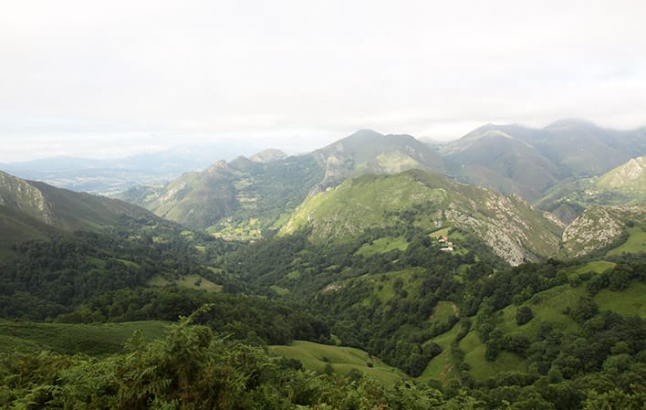Nach 1,5 Kilometern erreichen wir das Sellón-Feld, das sich am Fuße des Picu Facéu befindet und den ursprünglichen Ausgangspunkt darstellt. Wir nehmen den Weg links. Nach einem weiteren Kilometer steigen wir auf der alten Straße ab, die noch immer sichtbar ist und von der aus wir schöne Ausblicke genießen können.