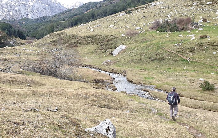 Nachdem wir den Colláu hinter uns gelassen haben, befinden wir uns im beeindruckenden Foiz Grande, wo wir unseren Weg zwischen zwei Gipfeln, dem Peña Rueda und dem Peña Arpín, fortsetzen. Bei Kilometer 3 müssen wir den Fluss überqueren und ihn beim nächsten Kilometer erneut überqueren.