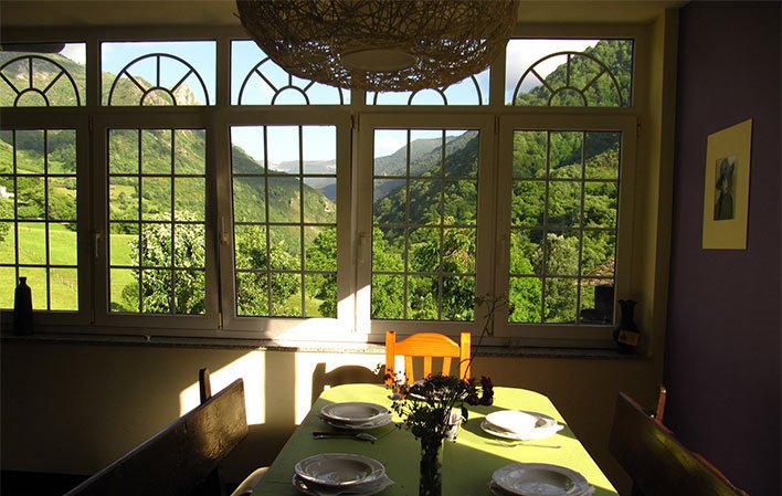 Aprovechando la gran galería de ventanales orientada al sur que recorre todo el restaurante, pusimos una cocina abierta en el centro, donde tanto desde el bar como desde el comedor se puede ver cómo se cocina y al mismo tiempo disfrutar de las hermosas vistas al valle, observando los colores del bosque en cada estación.