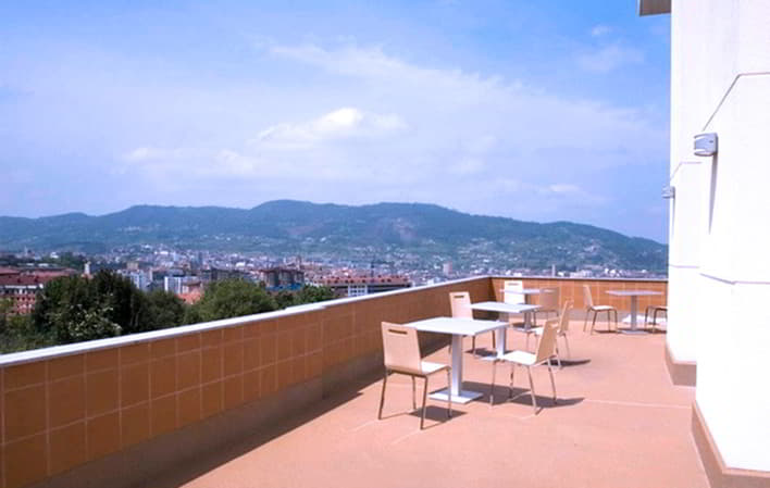 Restaurante del hotel del mismo nombre con amplios ventanales, desde los que se puede admirar la ciudad de Oviedo/Uviéu al completo.