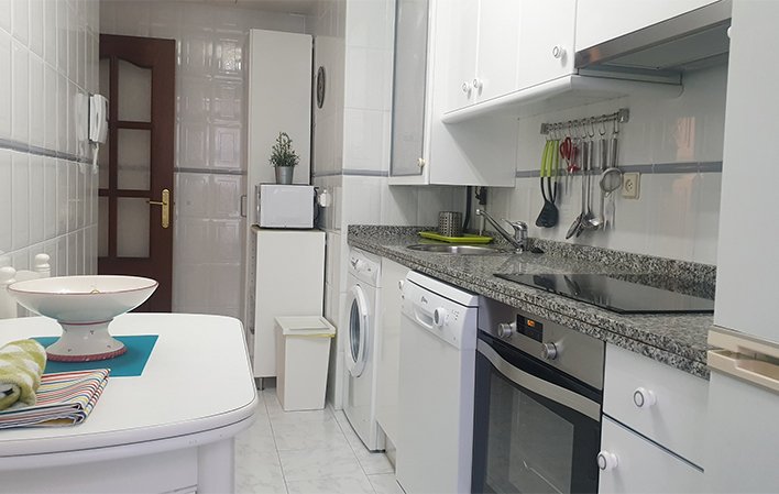 La cocina está totalmente equipada con todos los electrodomésticos necesarios para una estancia cómoda y sin preocupaciones, incluyendo vitrocerámica, lavavajillas, lavadora, horno microondas y nevera, además de todos los utensilios de cocina necesarios.