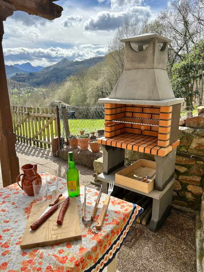 El espacio exterior cuenta con un porche soleado, zona de barbacoa y vistas panorámicas al valle del río Sella y a los Picos de Europa. En la parte trasera hay un bosque de robles centenarios y, debido a la ausencia de contaminación lumínica, en las noches despejadas se puede observar el cielo estrellado con gran nitidez.