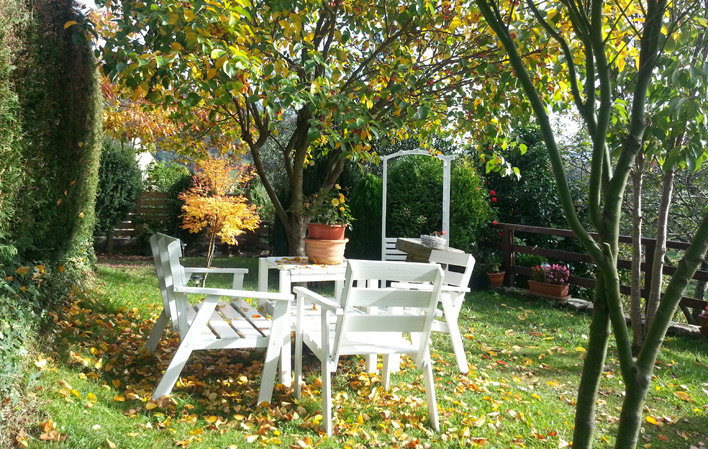 El jardín,al cual se accede desde el salón, cuenta con barbacoa.En él se encuentra un confortable porche desde el que se puede disfrutar del hermoso paisaje de la Sierra del Sueve.