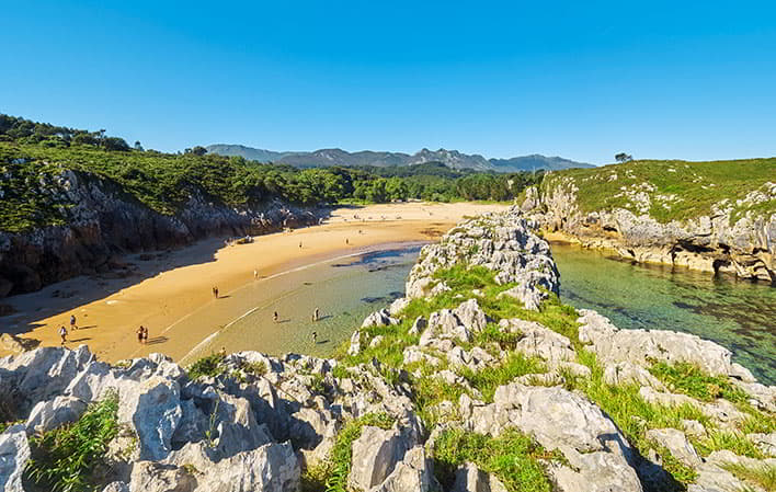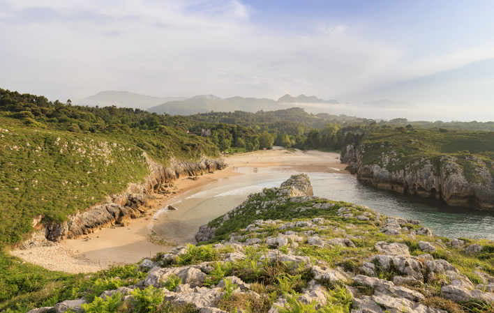 En la desembocadura del río Nueva, existe una playa salpicada por enormes formaciones rocosas perforadas por el mar que dejan al descubierto cuevas y túneles. Se trata de un paisaje kárstico de gran belleza.