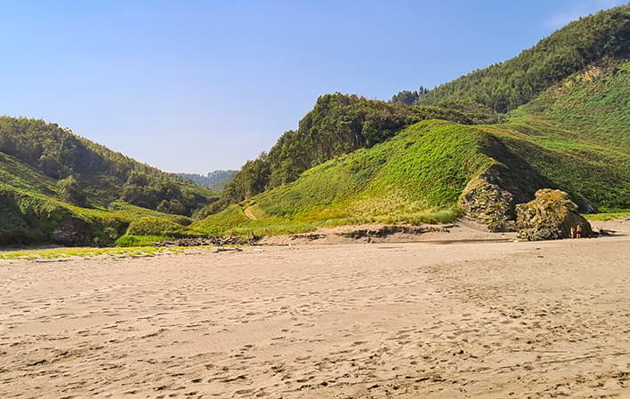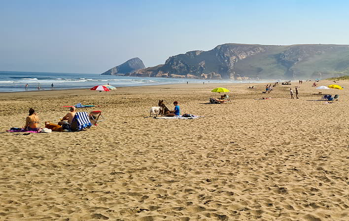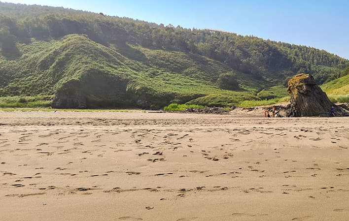 Es el arenal más largo del Principado. Con arenas doradas oscuras y fuerte oleaje