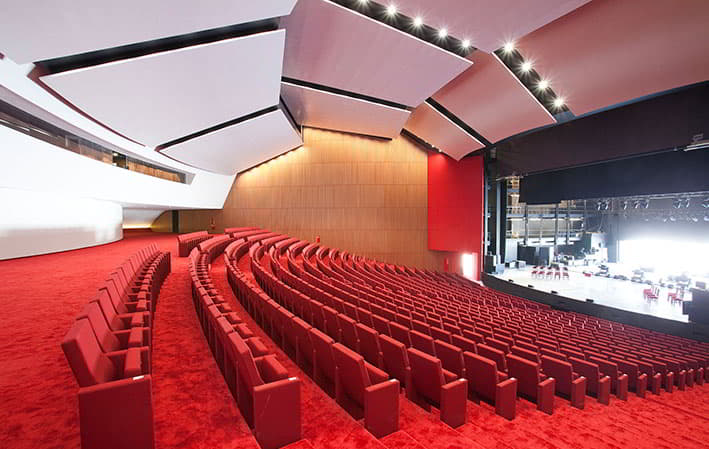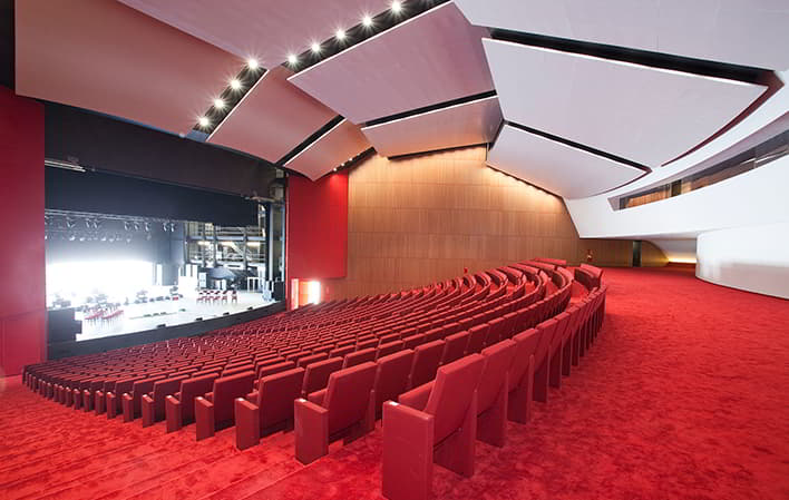 El escenario del Auditorio, destaca por sus cualidades sonoras, además de por sus dimensiones y funcionalidad, ya que puede abrirse hacia la plaza, y ofrecer espectáculos hasta a diez mil personas.