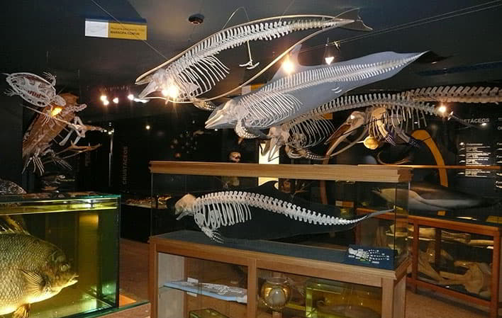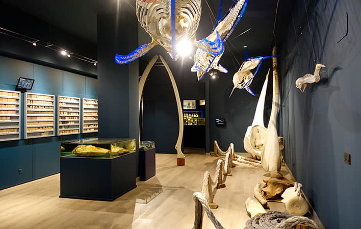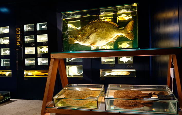 Área de Vertebrados Marinos: Incluye diversidad de fauna vertebrada del medio marino (peces, aves, reptiles y mamíferos). Es la zona más llamativa del Museo, ya que aquí se encuentran numerosos esqueletos de tortugas y mamíferos marinos, así como una gran tortuga laúd disecada y varios peces singulares.