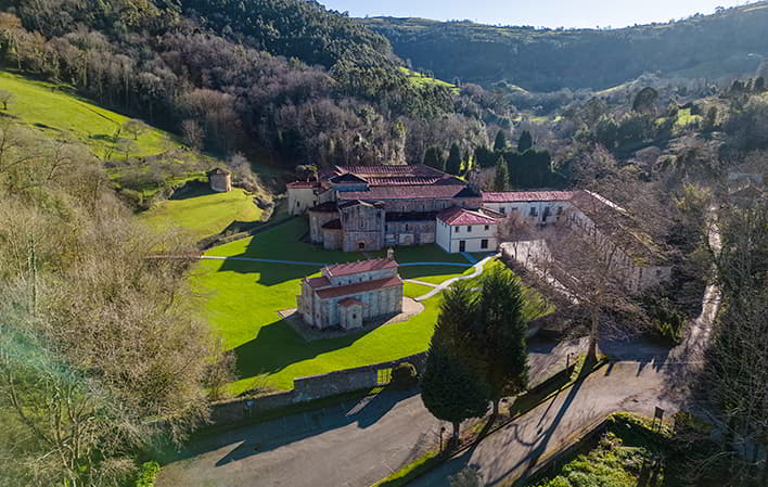 La iglesia de San Salvador de Valdediós, del del s. IX, la mandó construir Alfonso III, junto con otras dependencias palaciales, su estructura es de planta basilical de tres naves, cabecera tripartita con capillas de pequeñas dimensiones, y dos compartimentos adosados a los muros norte y sur que hacen externamente de falso crucero.