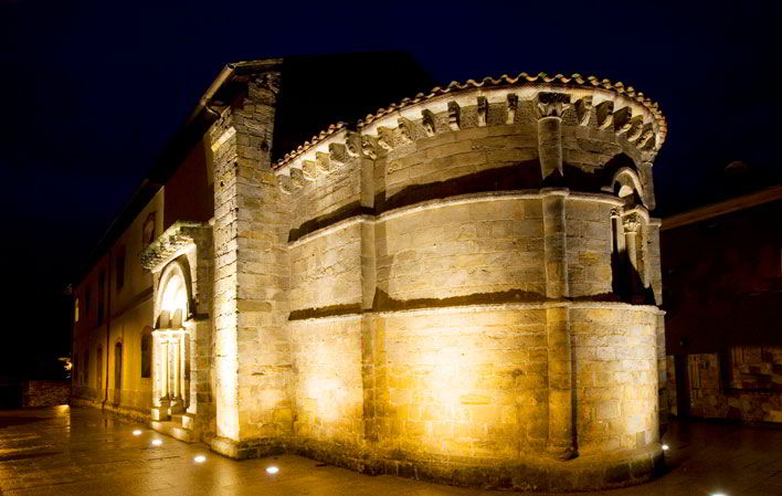À l'extérieur, l'abside présente deux colonnes accolées surmontées de chapiteaux végétaux, une corniche en damier avec des corbeaux et des métopes, une fenêtre centrale avec des colonnes et des chapiteaux végétaux et deux bandes de damier sur le pourtour. L'intérieur est couvert par une arcade aveugle de huit arcs, et conserve l'arc triomphal cintré avec des chapiteaux à poussière en damier et des chapiteaux végétaux.