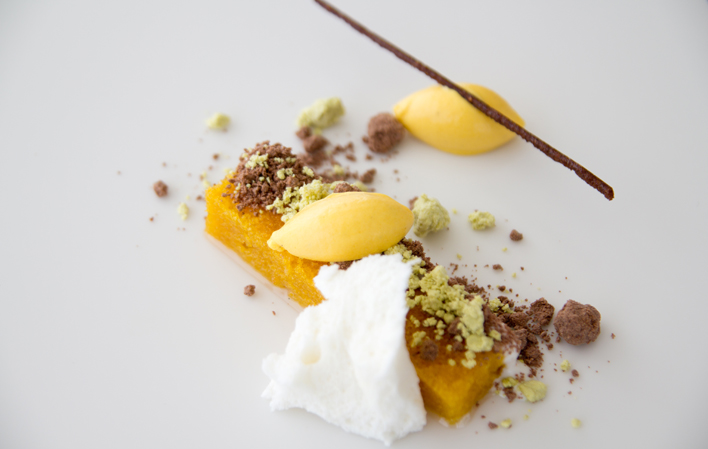 Helado de calabaza y mandarina: Hervir el agua, el estabilizante, el azúcar y la dextrosa e incorporar el resto ya fuera del fuego, dejando reposar 24 horas en bidones de pacojet. Congelar y turbinar.