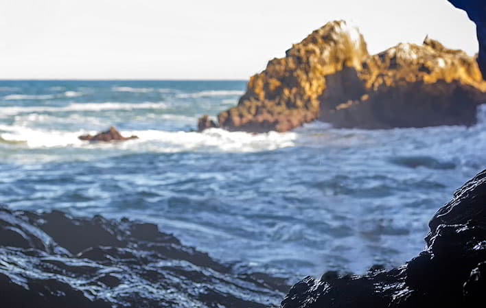 Completa este complejo un gran arco de piedra sobre el mar conocido como Puente Caballo, y un bufón con desarrollo oblicuo hacia la playa.