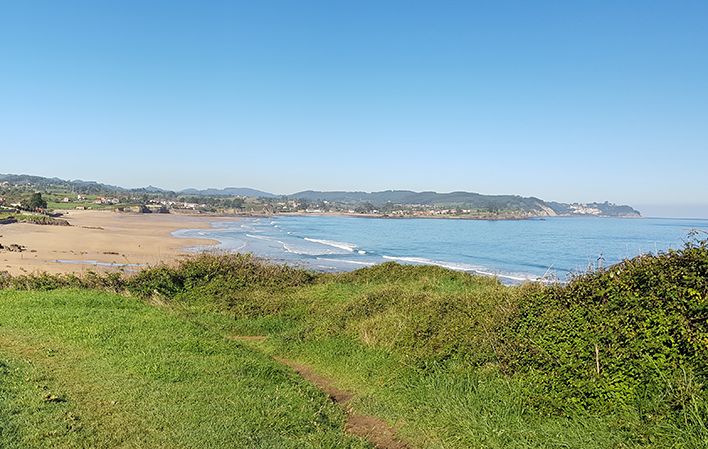 Aprovechando parte del Camino de Santiago, alargamos la ruta Entreplayas para acercarnos desde la playa del Arenal de Morís hasta el yacimiento jurásico de la playa de la Griega, descubriendo más playas en el camino. Entre pastos y mar, pisando la arena o sobre acantilados, vamos disfrutando de las vistas de la Sierra del Sueve, a un lado, y de la costa, al otro.