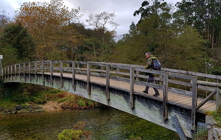 El río Purón se cruza por una pasarela singular de madera laminada, luego se asciende en ligera y continuada pendiente, hasta el núcleo de Andrín, en el kilómetro ocho y medio.