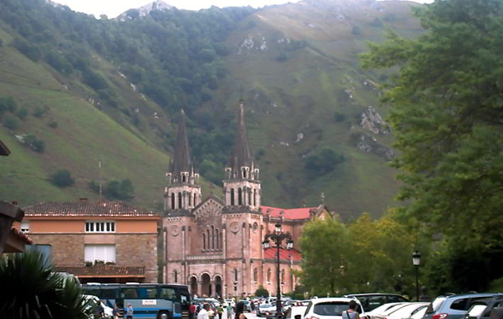 Al llegar junto al aparcamiento nos encontramos con una pasarela de madera que cruza por encima de la carretera. En este punto tenemos dos opciones: la primera consiste en coger la pasarela que nos conduce a la basílica de Covadonga a través de un bello bosque; y la segunda es continuar por la carretera hasta la Santa Cueva y luego ascender a la basílica.