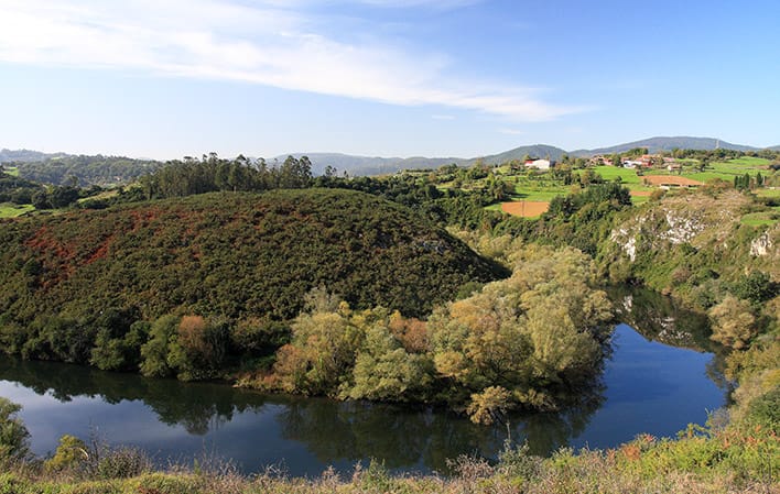 Cuando llevamos caminados 2,5 kilómetros, encontramos un desvío hacia la izquierda, que tomaremos, ya que nos lleva hasta el mirador de los meandros del Nora, desde donde podemos observar el hermoso paisaje que nos ofrecen los meandros.