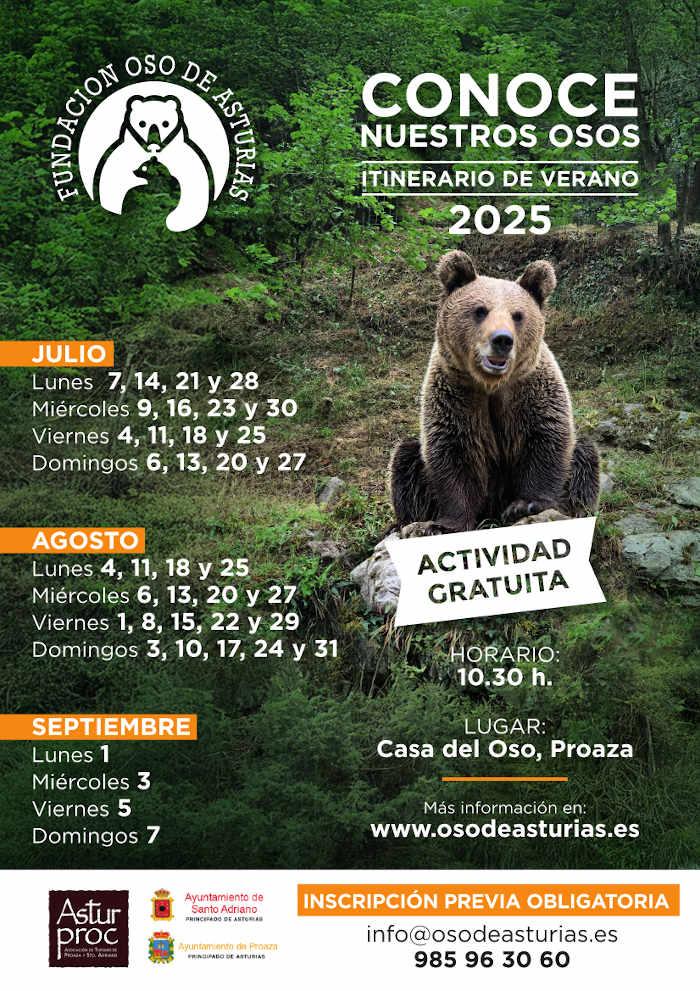 La Fundación Oso de Asturias (FOA) inicia su itinerario de verano Conoce nuestros osos, unas sesiones didácticas dirigidas por personal de la fundación con el objetivo de dar a conocer la situación del oso pardo cantábrico y su hábitat, así como el trabajo que realiza a diario con la osa Molina, y las causas que han llevado a que resida en los cercados oseros.