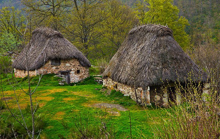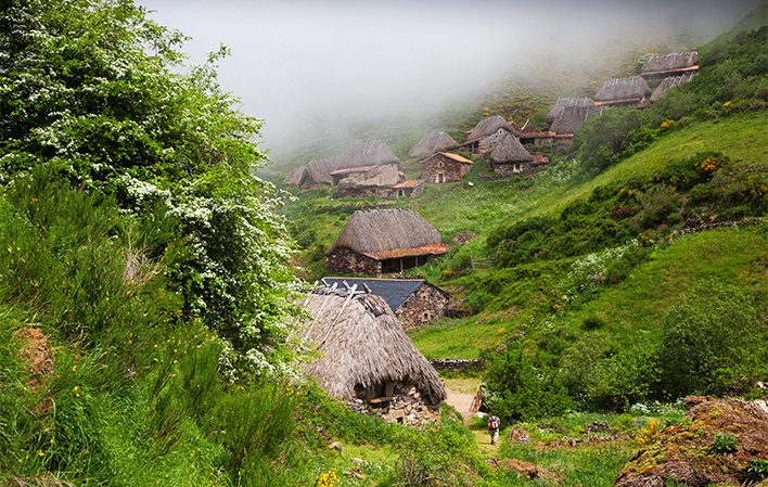 The Pigueña Valley Route (PR.AS 14.1) starts here, where you can visit the Braña de La Pornacal, one of the largest and best preserved in the Somiedo Natural Park. A braña is the name given to the mountain area where livestock graze in the late summer pastures; in some cases there are usually small huts where shepherds take shelter from storms or spend the night. The La Pornacal hut is made up of a group of thirty-four huts, rectangular in shape and covered with plant material, known as "teito" huts. After this brief introduction, we invite you to take a closer look at these constructions and their inhabitants, the vaqueiros de alzada.