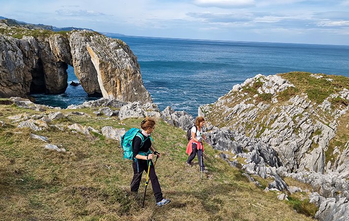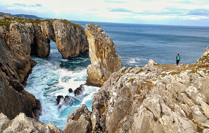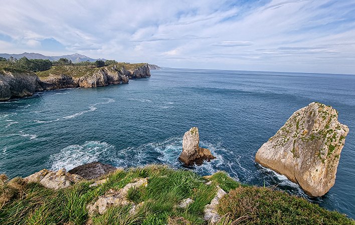At any point along this route you can enjoy the sculptures that the sea has carved into the rock over the centuries. Between scrubland, cows and goats, we can see small boats from nearby Ribadesella/Ribeseya fishing in the waters of the Cantabrian Sea, looking for fish for us to enjoy fresh at the end of their task.