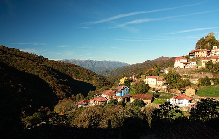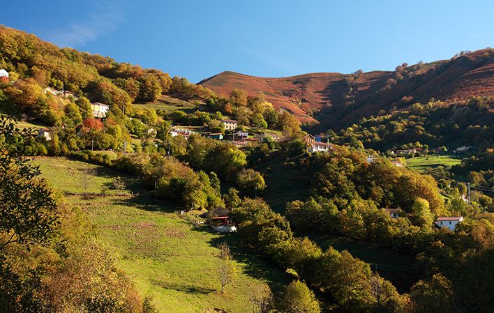 The route starts in La Güeria (Urbiés). Leave from the car park located on the MI-3 road and go down a path that crosses the street. A few metres further on you will have a panoramic view of the Urbiés mountain range. Approximately half a kilometre further on, to our left, we will see the remains of the old Mosquil mining shaft. We then continue along the path.