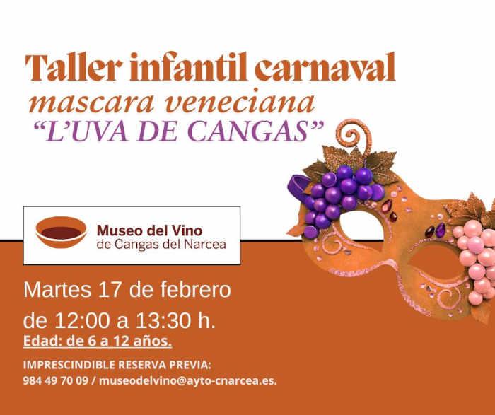 - 17 de febrero. Máscara veneciana L'uva de Cangas. Taller infantil en el Museo del Vino de 12:00 a 13:30 h. Imprescindible reserva previa: 984 49 70 09 / museodelvino@ayto-cnarcea.es