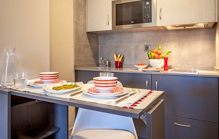 Los estudios se componen de cocina equipada, dormitorio, baño, idóneos para turistas, estudiantes y huéspedes en estancia de trabajo. Disponemos también de cafetería, salón con zona de trabajo y lavandería de autoservicio.