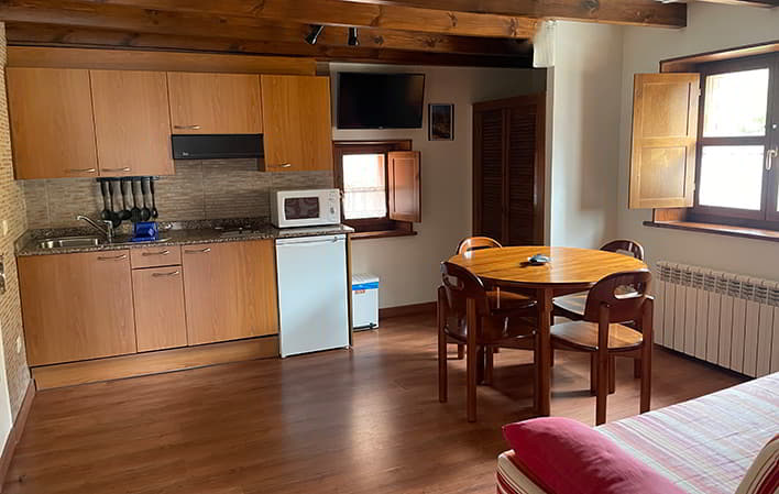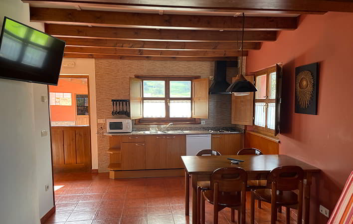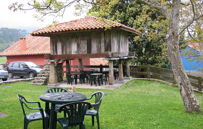 El edificio ha sido rehabilitado y se le ha dotado de todas las comodidades. Se encuentra rodeado de un jardín en el que hay un hórreo (edificación típica asturiana donde se guardaban las cosechas) con más de 300 años de antigüedad y bajo el que colocamos la terraza.