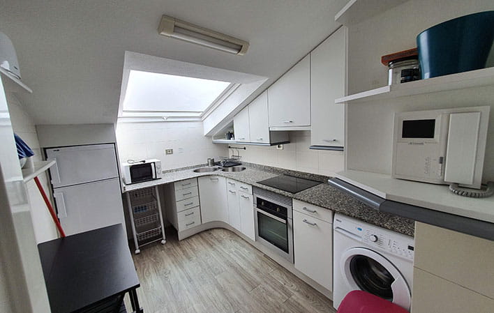 Este ático cuenta con tres habitaciones, dos de ellas dobles, así como dos baños y una cocina completamente equipada. Además, ofrece un amplio salón de 30 m², donde los huéspedes pueden disfrutar de su estancia con comodidad.