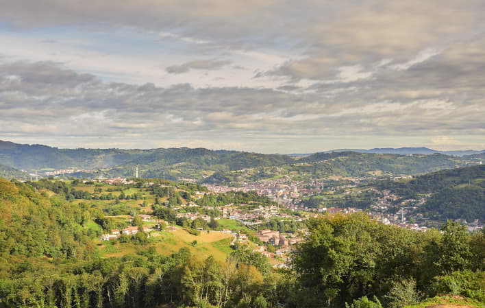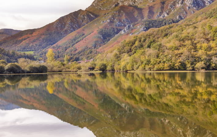 Panoramic view of the village of Caleao, in the Redes Natural Park, with stone houses and red tile roofs surrounded by green mountains and forests, under a partly cloudless sky.