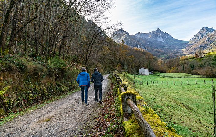 Abandonarse a la soledad de este camino, entre árboles, rocas y el rumor continuo del agua, unas veces más cercano y otras más alejado, entre rosales silvestres, espinos blancos, carbayos… acompañados por los trinos de petirrojos y chochines mientras poco a poco vamos ganando altura para ir descubriendo pequeñas cabañas, antiguas minas de carbón o rebaños de cabras, es posible en esta caminata hacia el cielo de este valle.