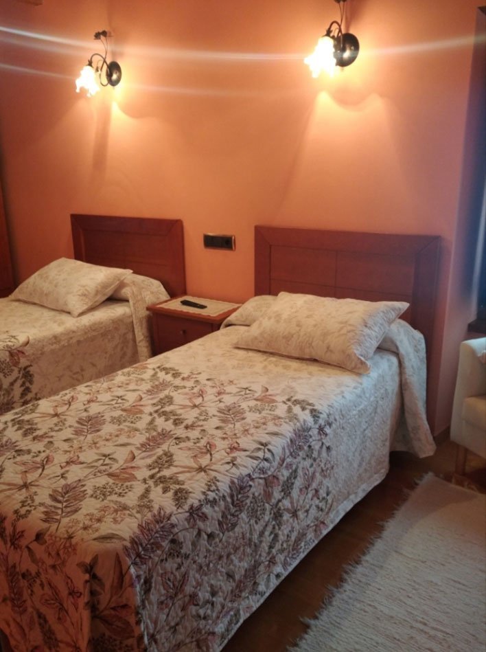 La casa dispone de tres habitaciones, dos de ellas con cama matrimonial y la otra dispone de dos camas independientes. Dispone de dos baños, uno en la planta superior con plato de ducha, y el otro en la planta baja con bañera.