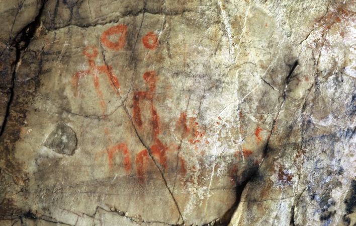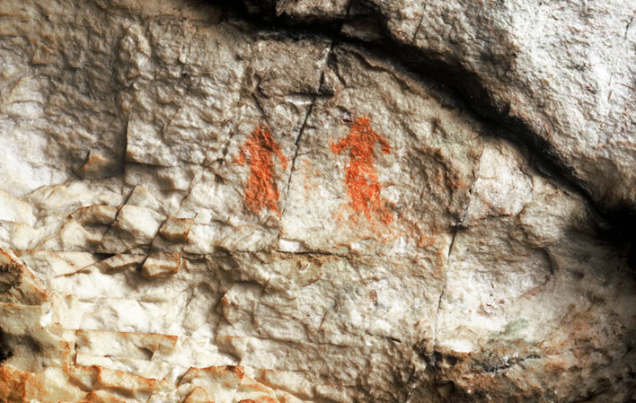 Le mur de droite est plus abrupt et moins propice à la peinture, c'est pourquoi les peintures existantes sont rares et profitent des quelques plans lisses qui existent.