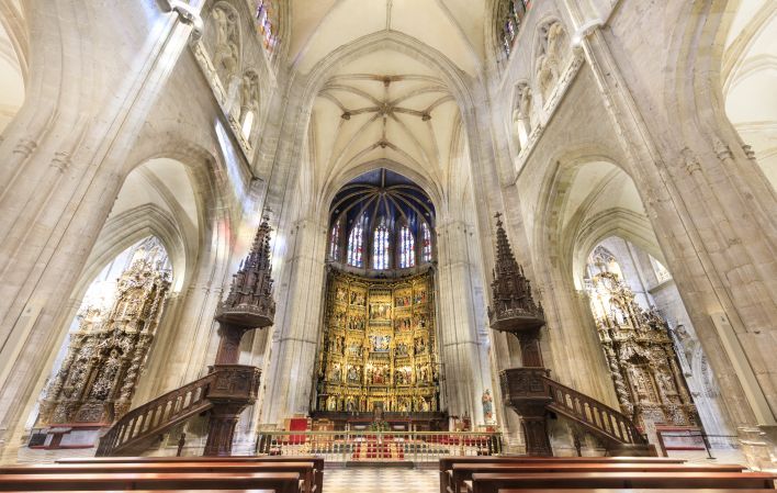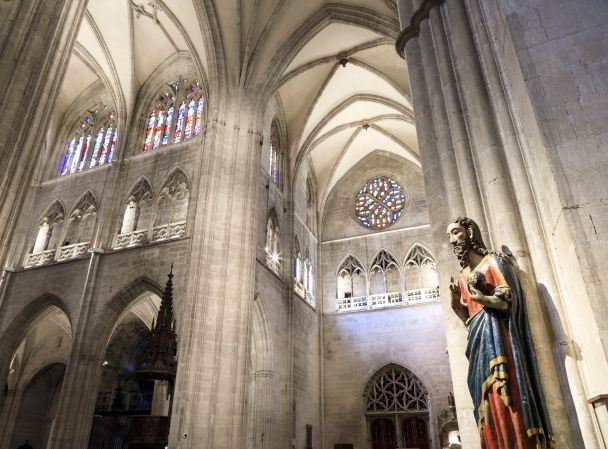 Durante el siglo XIV comienza la construcción de la Catedral Gótica, demoliéndose la anterior basílica Románica y Prerrománica, dicha construcción finaliza a mediados del siglo XVI, con el remate de la torre, es decir casi tres siglos dura la construcción del templo. Además, fue necesario trabajar durante otros cien años en la construcción de las capillas y panteones que hoy vemos adosados a las naves laterales. Por consiguiente, el proceso completo de construcción de la catedral abarca aproximadamente cuatro siglos, destacando el intenso trabajo durante el siglo XV, época en la que prevalece el estilo gótico florido o flamígero, al que pertenece nuestra catedral.