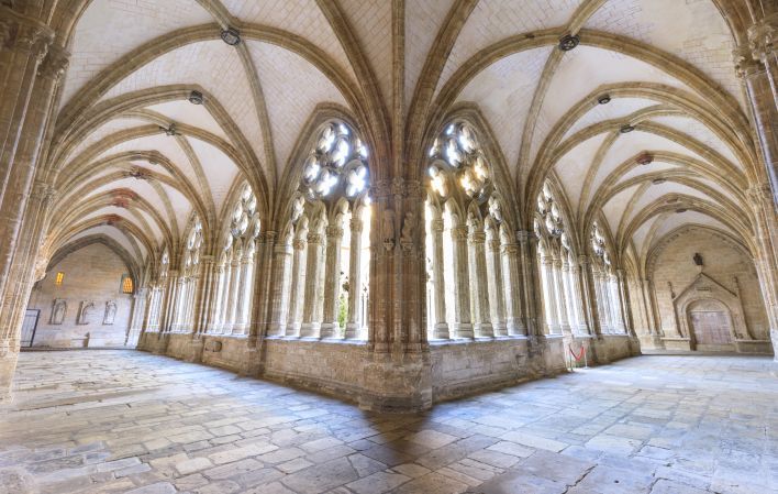 En la Etapa Gótica, el Claustro Gótico, sustituyo al románico anterior, destacando el él sus ménsulas y capiteles con una rica y variada iconografía que abarca tanto temas profanos como religiosos, así como leyendas medievales y motivos específicamente asturianos, como la lucha de Favila con el oso. En el muro sur del Claustro se encuentra la Puerta de la Limosna, con figuras esculpidas de Santiago, San Pedro, San Pablo y San Andrés en las jambas, la figura de El Salvador en el tímpano, y la Virgen de la Leche en el pilar central. Junto a esta puerta se sitúa la llamada Capilla de la Hidria, donde, según la tradición, se guarda una hidria de las Bodas de Caná, uno de los milagrosos vestigios más visitados por los peregrinos.