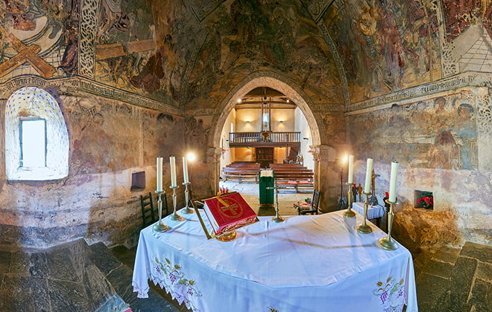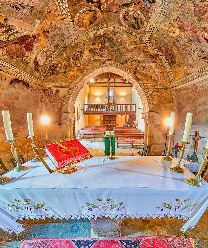 L'interno è coperto da un tetto in legno, ad eccezione della cappella principale, che è coperta da una volta a botte a sesto acuto. La cappella è separata dalla navata da un arco trionfale leggermente a sesto acuto e l'intera area dell'abside e del presbiterio è decorata con pitture murali del XVI secolo.