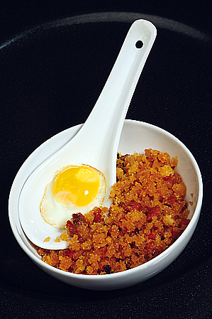 Cucchiaio di briciole di boroña con compango tritato e tuorlo d'uovo