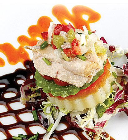 Disegniamo una griglia con una riduzione di Modena, sulla quale disponiamo un letto di varie lattughe. Poi, con l'aiuto di uno stampo, disponiamo la patata confit sulla base, sopra la quale mettiamo il peperone verde arrostito e il peperone rosso arrostito. Sopra di essi, il concassé di pomodoro e infine, coprendo la patata, i peperoni e il montadito di pomodoro, disponiamo i filetti di pancia tagliati a fette sottili.