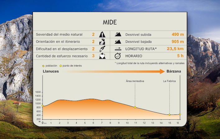 L'itinerario principale si dirige dapprima verso nord, avvicinandosi al paesaggio protetto della Sierra del Aramo, e poi prosegue verso sud-ovest, in direzione del Parco Naturale Las Ubiñas-La Mesa, per terminare nel villaggio di Bárzana, nella valle del fiume Trubia.