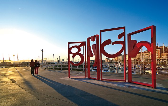 Dalla stazione ferroviaria di Sanz Crespo, il percorso si snoda lungo la pista ciclabile Poniente, passando per la Plaza Mayor. Con i suoi caratteristici portici e nel cuore dell'antico quartiere di Cimadevilla - zona di sidreria per eccellenza - nelle immediate vicinanze si trovano il Municipio e la scultura del Re Pelayo affacciata sul mare, che saluta timidamente le imbarcazioni che hanno deciso di attraccare al porto turistico di Fomento. Ma... perché non fermarsi un attimo prima di raggiungere la piazza, ai margini del porto, per farsi fotografare accanto alle lettere di Gijón?