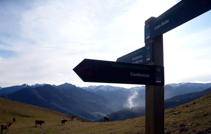 La quinta tappa del GR-208 "Anillo Ciclista Montaña Central" inizia alla periferia di Santibanes de Murias, percorrendo la strada AE-3 in discesa per imboccare la prima deviazione a destra che sale su un sentiero contrassegnato dalle sigle PR-AS 133 e 236, lungo il quale passa anche il GR-109 "Asturias Interior". Proseguiamo su questo sentiero, che presto diventerà più pianeggiante, fino a raggiungere la frazione di Vil.lar, che attraversiamo per dirigerci a est verso Coto Bello lungo un tratto ora in salita.