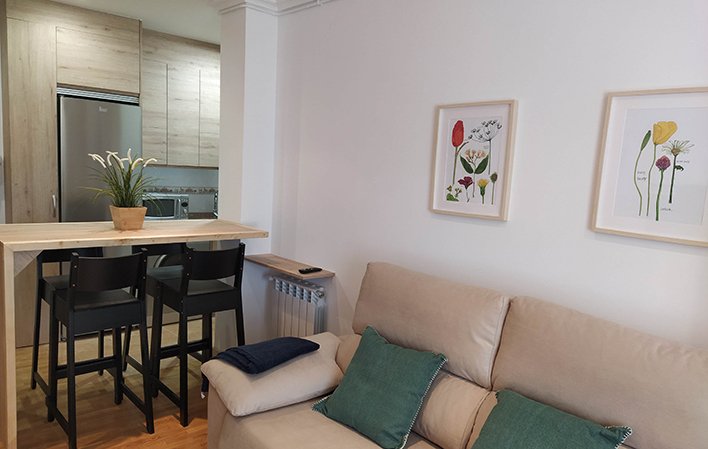 El salón cuenta con una Smart TV de 49 pulgadas para tus momentos de entretenimiento, junto con un cómodo sofá cama con apertura italiana, proporcionando un espacio adicional para dormir si es necesario. Además, se ofrece todo el ajuar necesario, desde sábanas y edredones hasta juegos de toallas, así como vajilla, cubertería y cristalería.