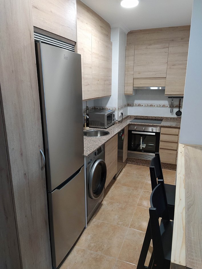 En su dormitorio principal, encontrarás dos camas que pueden unirse para formar una cama de tamaño king o mantenerse separadas según tus preferencias, junto con un armario espacioso y un baño integrado para tu comodidad. La zona de estar, integrada con la cocina, está equipada con electrodomésticos modernos, incluyendo una cocina vitrocerámica, un lavavajillas, una lavadora/secadora, un frigorífico combi y un horno microondas, así como utensilios esenciales como batidora, plancha y todo lo necesario para cocinar.