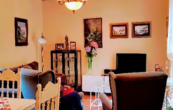 Aparcamiento en la misma casa, o en el prado, accediendo por la parte superior. Un espacio ideal para niños pues la finca está cerrada y hay una cama elástica y un cenador. Es una casa de planta baja rodeada de flores, buganvillas, hortensias, geranios, licinias, un salón acogedor con vistas a la montaña y unos espacios exteriores con distintos ambientes.