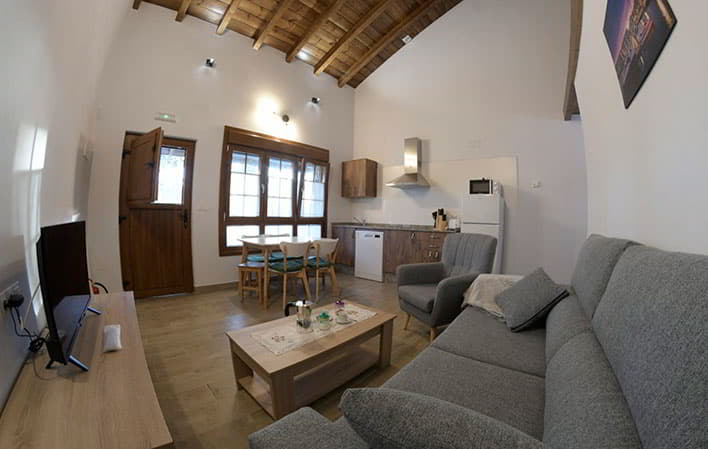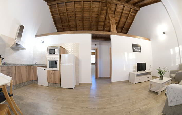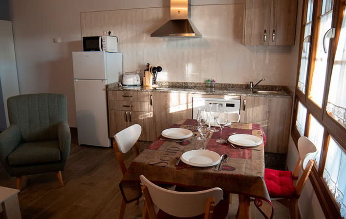 Los Apartamentos Camín Real cuentan con una cuidada decoración que sigue las pautas del entorno rural, empleando materiales nobles como la madera, la piedra y la cerámica.