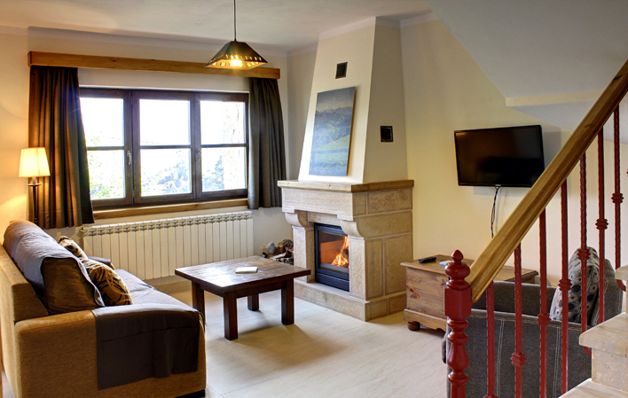 Ambos disponen de calefacción central, chimenea, terraza, cocinas equipadas con placas de inducción, lavavajillas, microondas, tostador, cafetera y todos los utensilios. Baños con bañera de hidromasaje de triángulo, secador…. Uno de ellos dispone de dos dormitorios y el otro de uno, si bien ambos tienen la misma superficie y la mismas plazas.