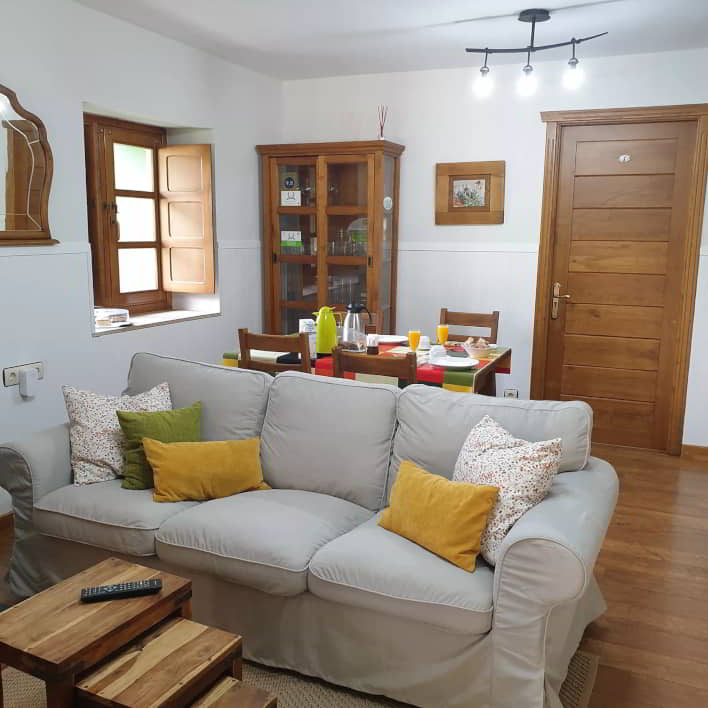 La casa incluye un salón amplio con chimenea que funciona también como comedor, concebido como un espacio de descanso y encuentro. La cocina está equipada con microondas, lavavajillas, horno, lavadora, vitrocerámica, cafetera, tostadora, batidora y menaje completo. Se ofrece la opción de alquiler íntegro o por habitaciones según las necesidades del visitante.