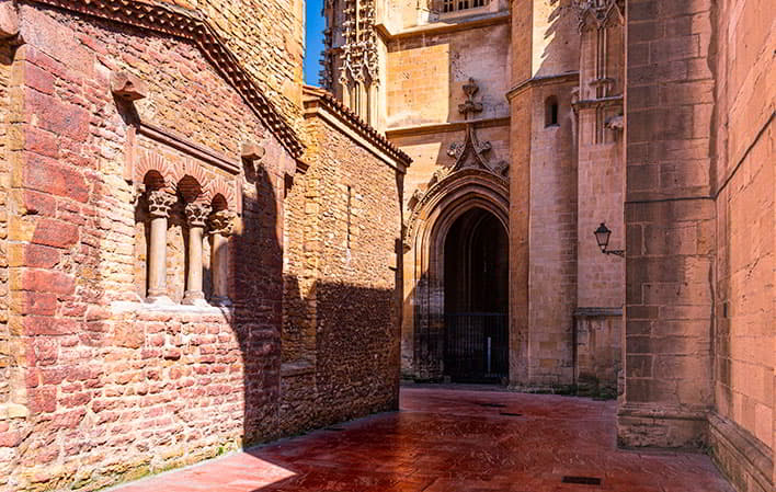 San Tirso el Real é muito mais do que uma igreja anexa à catedral. É uma peça fundamental do puzzle histórico e artístico do Principado. Todos os seus elementos formam um compêndio da evolução da arte religiosa, desde o pré-românico fundacional até ao barroco popular, passando pelo gótico reformista. Do primeiro templo fundado por Afonso II, o Casto, só resta a parte inferior da torre e a cabeceira da abside principal. O exemplo mais notável da sua construção original é uma janela trifurada com arcos de tijolo e colunas de mármore com capitéis romanos, que pode ser vista do exterior da igreja. Por cima, duas pedras perfuradas revelam o antigo sistema de fecho desta janela e, por cima, uma antiga moldura ainda conserva o traço do antigo telhado de duas águas. Trata-se, sem dúvida, de uma peça fundamental da arte pré-românica asturiana. É um dos poucos vestígios originais conservados in situ da arquitetura religiosa da época, capaz de transmitir a ideia de que, noutro tempo, construir uma igreja era mais do que erguer um edifício. Tratava-se de criar um mundo diferente, com as suas próprias regras e sob uma luz diferente.